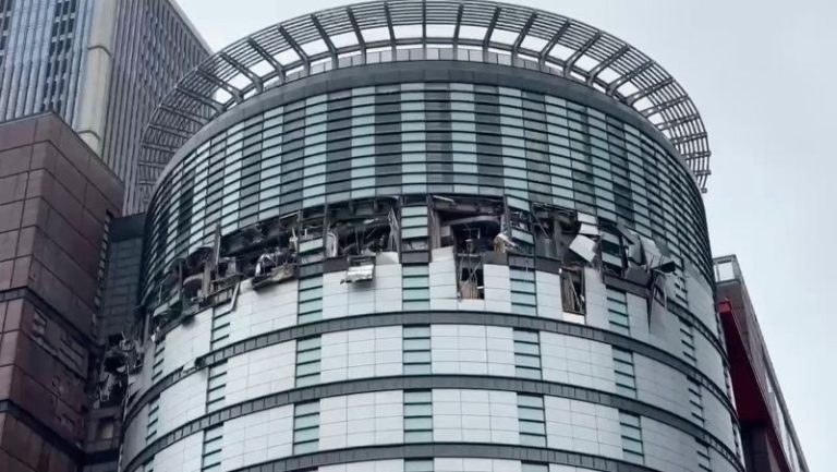 Dramatic videos of the explosion in the city of Taichung, on the island’s west coast, showed debris and large panels of a mid-rise building’s exterior blown out as a loud bang is heard. Footage shot by bystanders of the aftermath showed the street below littered with debris and two victims visible on the floor.